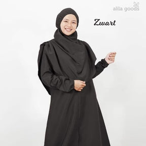 L’ensemble se compose de deux parties et est de la marque Alila Goods. Le tissu se compose d’une sorte de microfibres à séchage rapide et est léger même dans l’eau. Le hijab est attaché avec un élastique sur la tête afin qu’il reste bien en place.