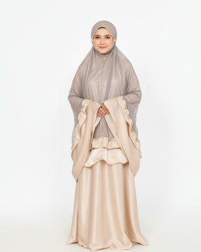 Mukena Zahira is vervaardigd uit hoogwaardige Santroni silk, gecombineerd met verfijnde tulle details voor een elegante en luxueuze uitstraling. De stof voelt zacht, licht en soepel aan, waardoor deze mukena zeer comfortabel is tijdens het gebed.