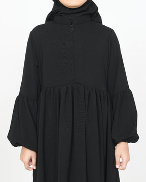 De Kinder Abaya Hanah is gemaakt van comfortabele Airplow Crinkle stof die licht en ademend is. Het heeft een losse pasvorm met een gerimpelde rok voor een modieuze uitstraling. De ballonmouwen met elastiek en twee zakjes aan de zijkanten geven de abaya een elegante en unieke look. De rits aan de voorkant maakt het gemakkelijk om de abaya aan te trekken. De abaya kan worden gecombineerd met een Khimar Hanah, die apart verkrijgbaar is en perfect past voor een complete en stijlvolle look.