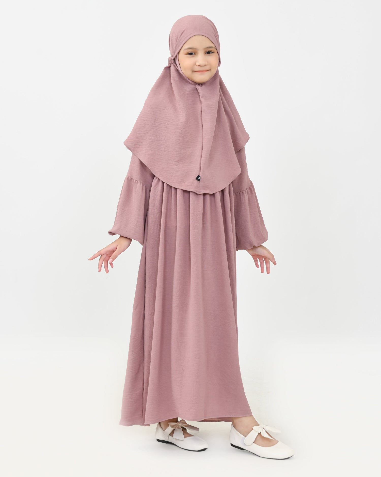 De pasvorm is ruim en comfortabel, waardoor hij perfect is voor zowel kinderen als dames. De khimar blijft goed zitten en geeft een elegante, bescheiden uitstraling.