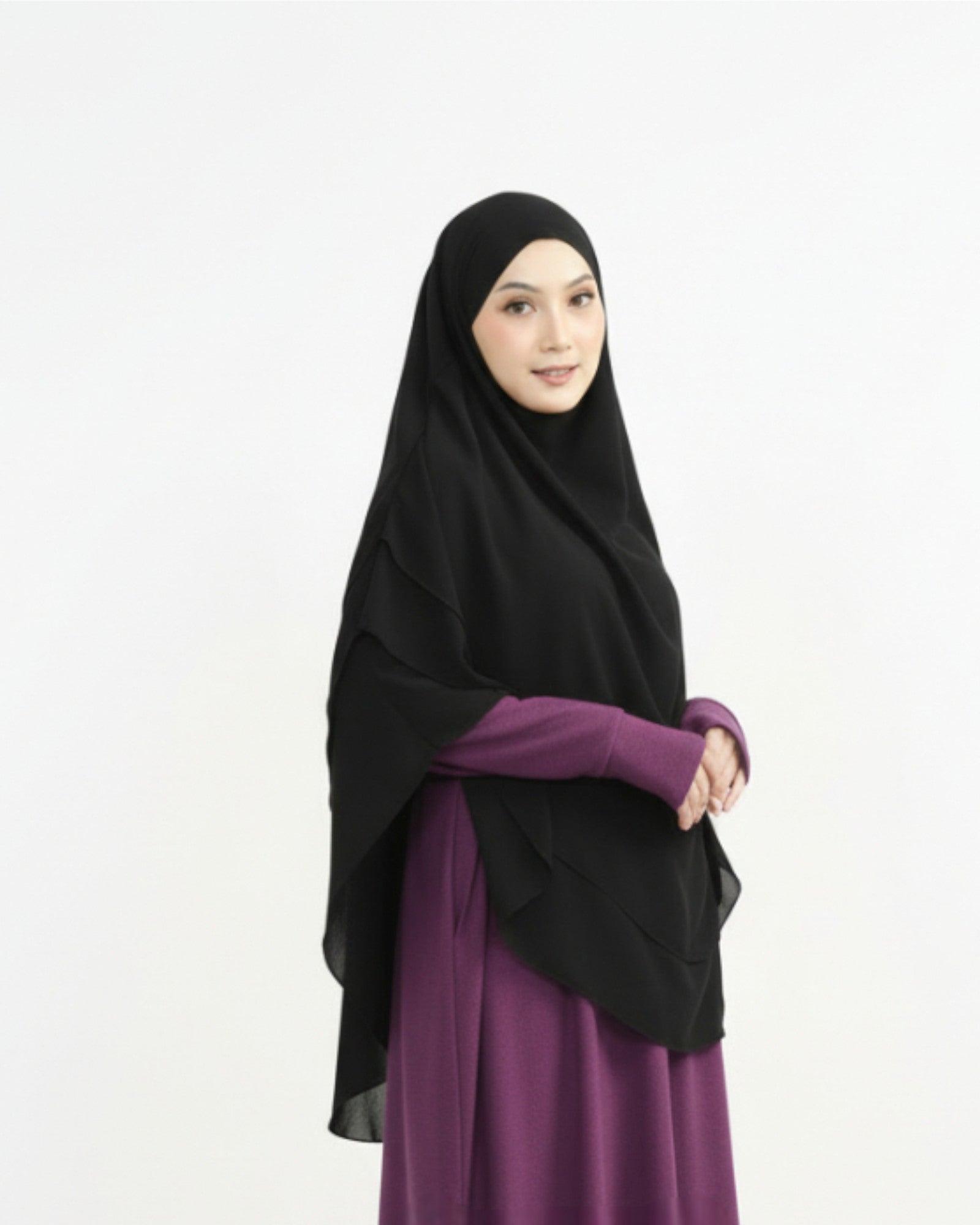 Khimar Humairah is een elegante khimar met 3 lagen van luchtige ceruti-stof. Het model heeft een tie-back aan de achterkant, waardoor hij stevig en comfortabel blijft zitten. De gelaagde uitstraling geeft een extra vrouwelijke en luxe touch, terwijl de lichte en ademende stof prettig is om dagelijks te dragen of bij speciale gelegenheden. Perfect te combineren met de Abaya Humairah of een andere eenvoudige abaya voor een stijlvolle en bescheiden look.